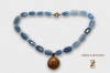 Náhrdelník vytvořený z podlouhlých akvamarínu, prokombinovaný drobným hematitem, doplněný o stříbrnou minci.